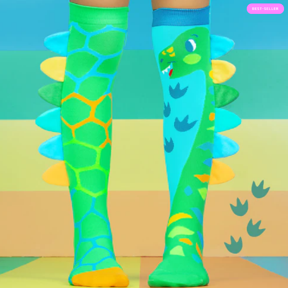 Let your imagination stomp wild with our boldest Dinosaur Socks yet! Featuring vibrant greens, cool blues, and bright pops of yellow, plus 3D plush spikes, these socks are made for little adventurers who love to stand out.