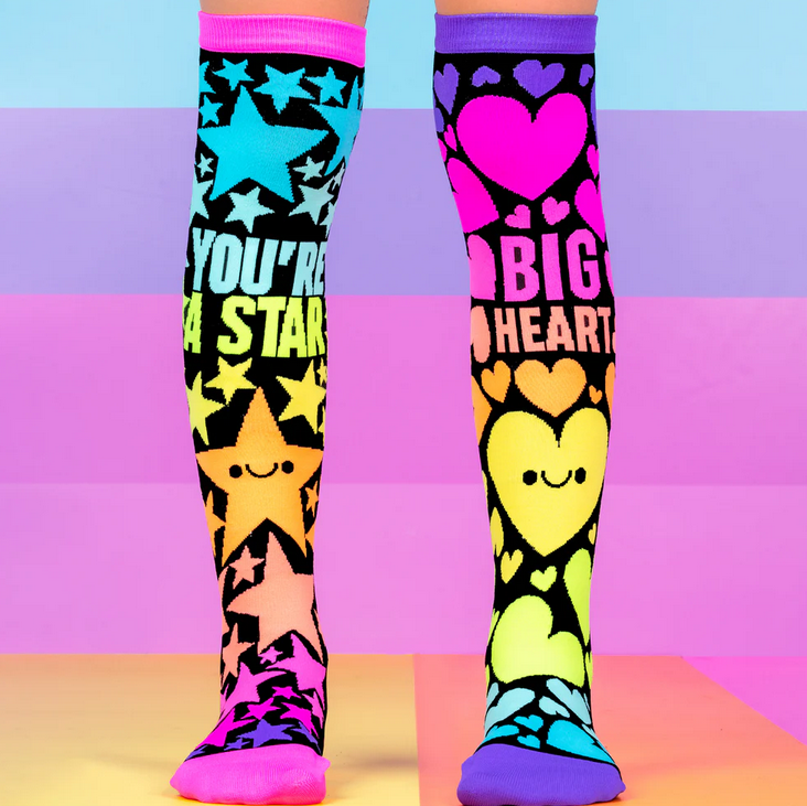 One sock twinkles with happy stars, the other bursts with colorful hearts—because you’re a star with a big heart!