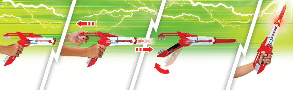 Blade Blasters up and ready for battle! Morph the Power Ranger weapon from Blaster to Blade in a slide of the handle.