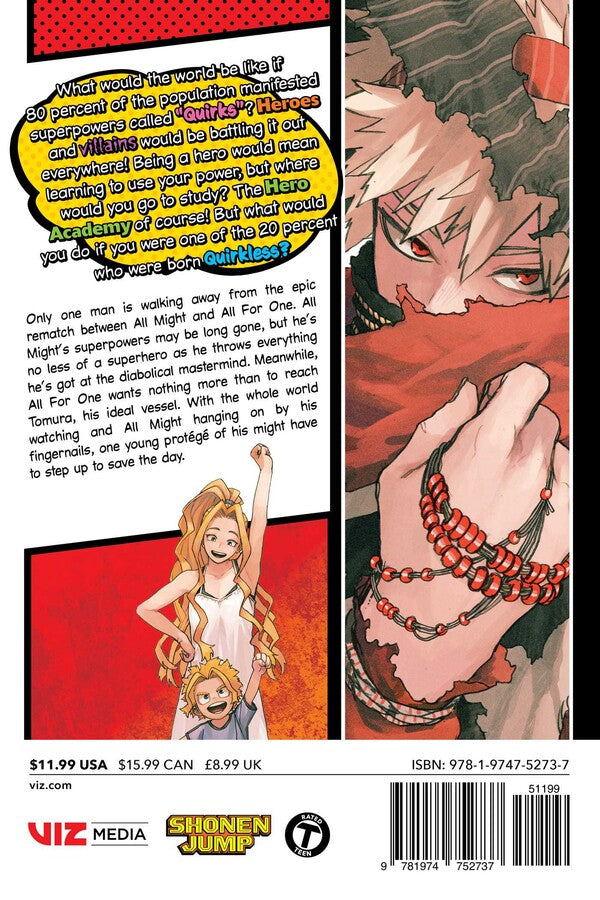 Only one man is walking away from the epic rematch between All Might and All For One. All Might’s superpowers may be long gone, but he’s no less of a superhero as he throws everything he’s got at the diabolical mastermind. Meanwhile, All For One wants nothing more than to reach Tomura—his ideal vessel. With the whole world watching and All Might hanging on by his fingernails, one young protégé of his might have to step up to save the day.