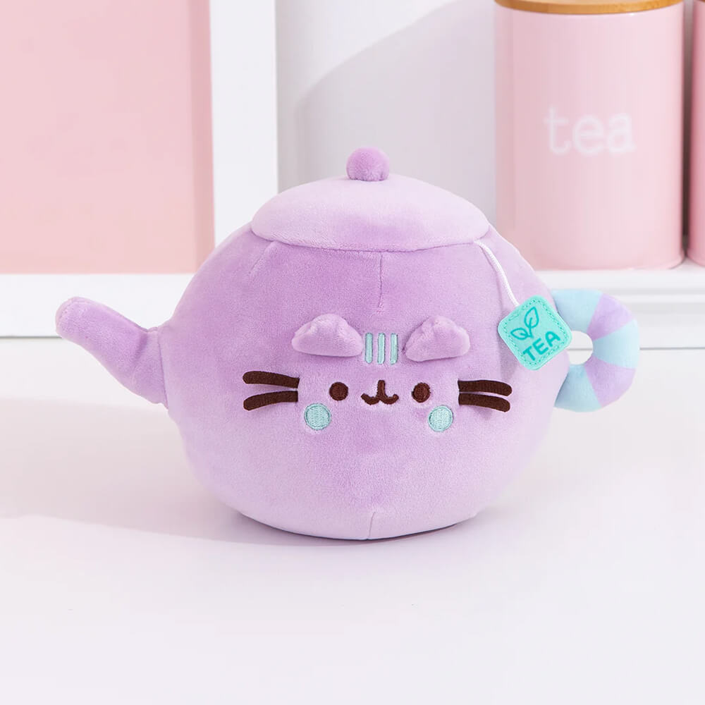 Cozy up with a warm, comforting cup of Pusheen! Pusheen is here as a soft, squishy and super squeezable teapot Squisheen. Her velvety lilac-coloured plush is made of super-soft, elastic materials that make her fun to squeeze, and this adorable plush has details sure to impress any Pusheen plush collector. Pusheen's delicately curved spout sits opposite a teal-and-purple striped handle loop, which matches her adorable teal embroidered facial details. Her cheeks and stripes are accented by a small square felt teabag tag that hangs from her lid, adorned with a printed leaf design. Give her a squeeze any time you need a soothing cup of cuteness!