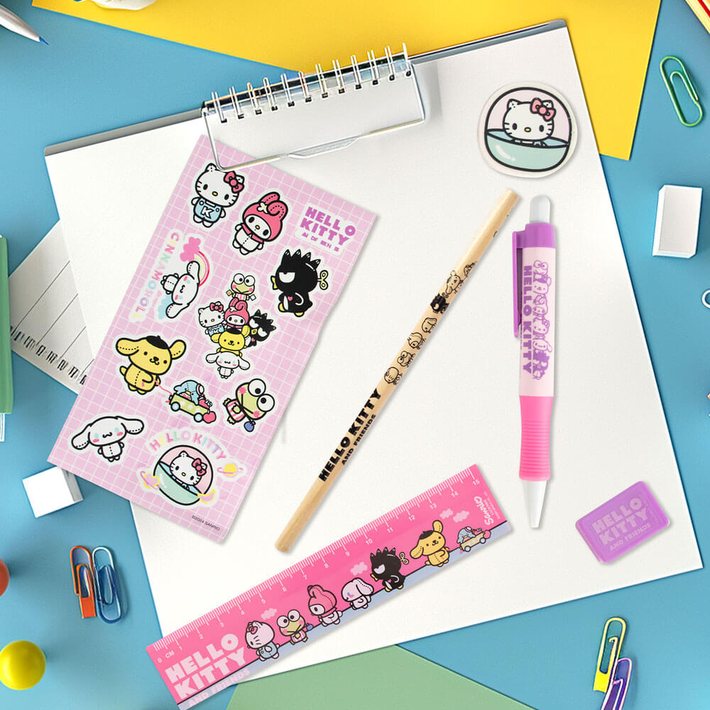 Upgrade your school or office supplies with the Hello Kitty Stationery Set! Featuring a collection of must-have items adorned with Hello Kitty’s iconic design, this set makes every writing task a little cuter. Packaged in a recyclable packet! Hello Kitty stationery set includes 15cm ruler, eraser, pen, pencil, sharpener and sticker sheet. 10 stickers included.