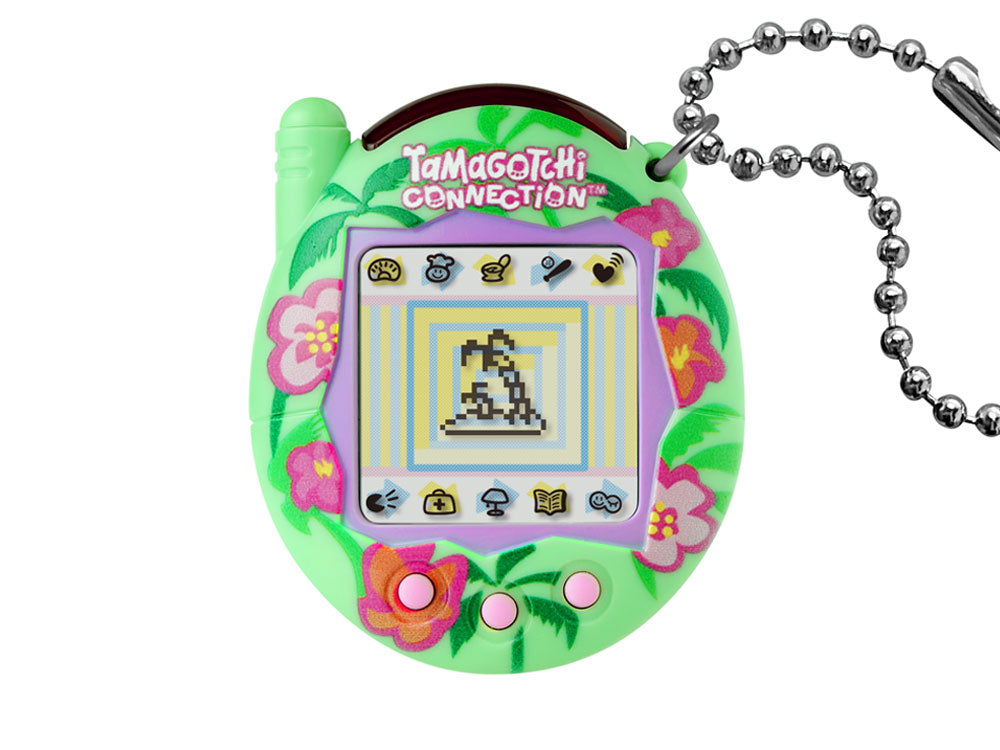 With revamped programming from the nostalgic 2000s device, Tamagotchi Connection is back with a classic tropical flowers shell! Raise an interactive virtual pet with characters that differs depending on how well you take care of them. Play games with it, feed it food, and cure it when it is sick, and it will develop into a good companion!