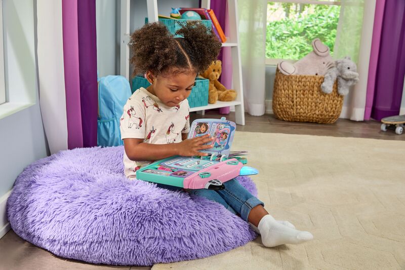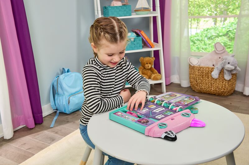 This paw-tastic Cat-a-Vator Discovery Book includes 14 interactive book pages to engage with! Move the Cat-A-Vator Mode Slider to access the three activity modes and explore the Dollhouse with Gabby and friends. Your child can learn about the 28 Dollhouse words and jam to cute sounds with DJ Catnips music.