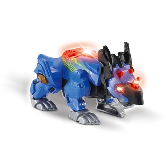A thorn in the side of any challenger, it's Thorn the Triceratops! This mighty 2-in-1 Triceratops plays wild sound effects, cool phrases and fun Triceratops facts with light effects at the press of a button! The included super car toy adds to the fun, and in a few simple steps can be switched and combined with Thorn to form amazing battle armour! Once combined, Thorn features cool blades that flip out, and special light and sound effects! Thorn is now powered up and ready to take on any foe! Who'd dare take on this dino? Let's Switch & Go!